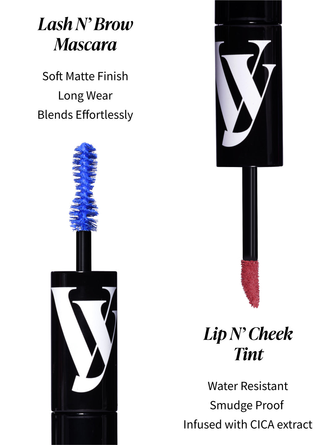Dual-ended 4-IN-1 Lip N’ Cheek Tint and Lash N’ Brow Mascara.