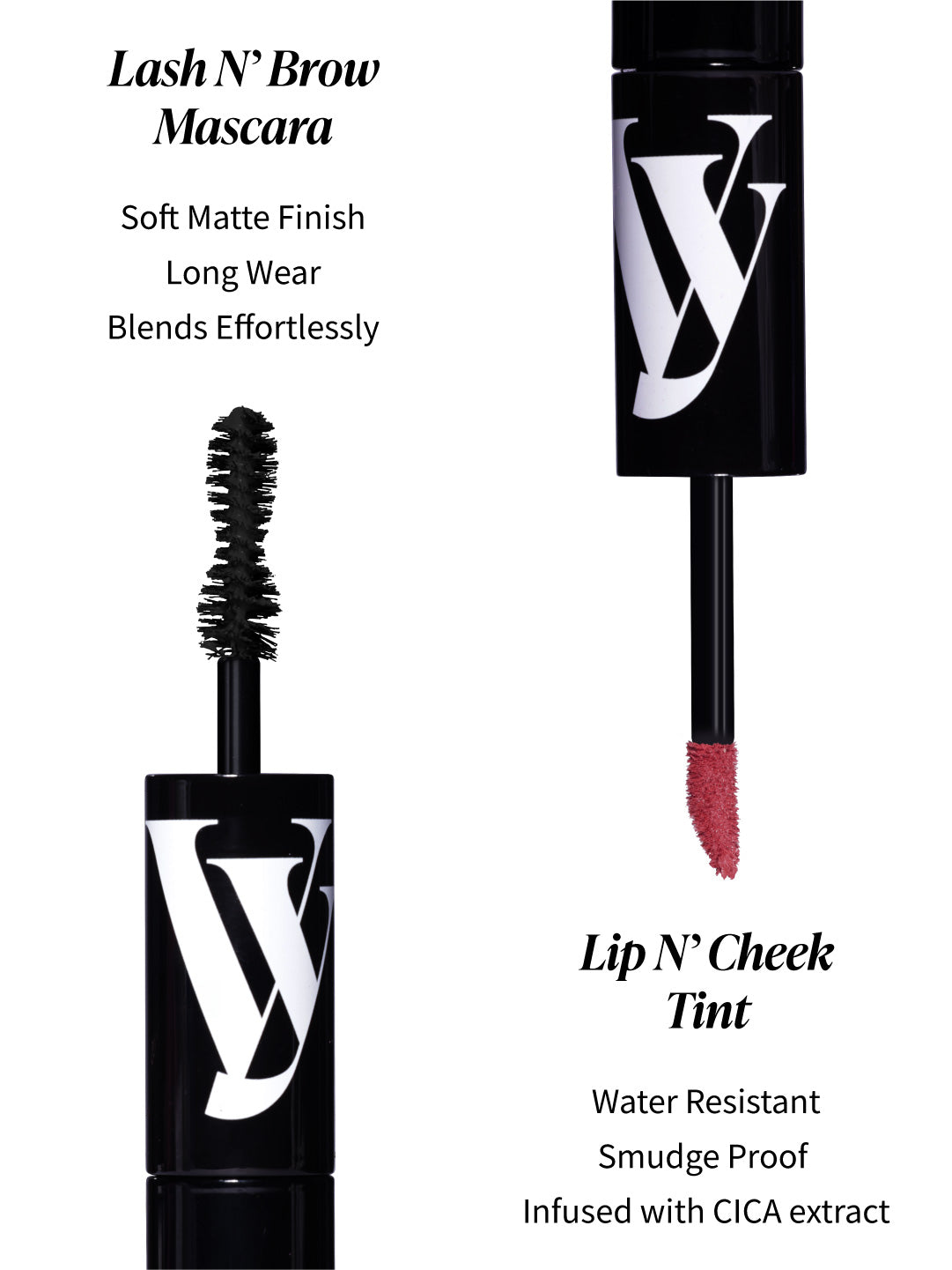 Dual-ended 4-IN-1 Lip N’ Cheek Tint and Lash N’ Brow Mascara.