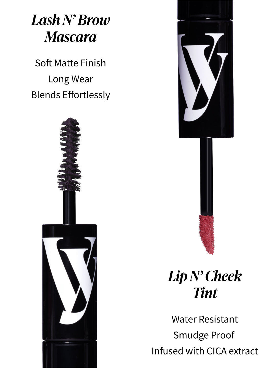Dual-ended 4-IN-1 Lip N’ Cheek Tint and Lash N’ Brow Mascara.